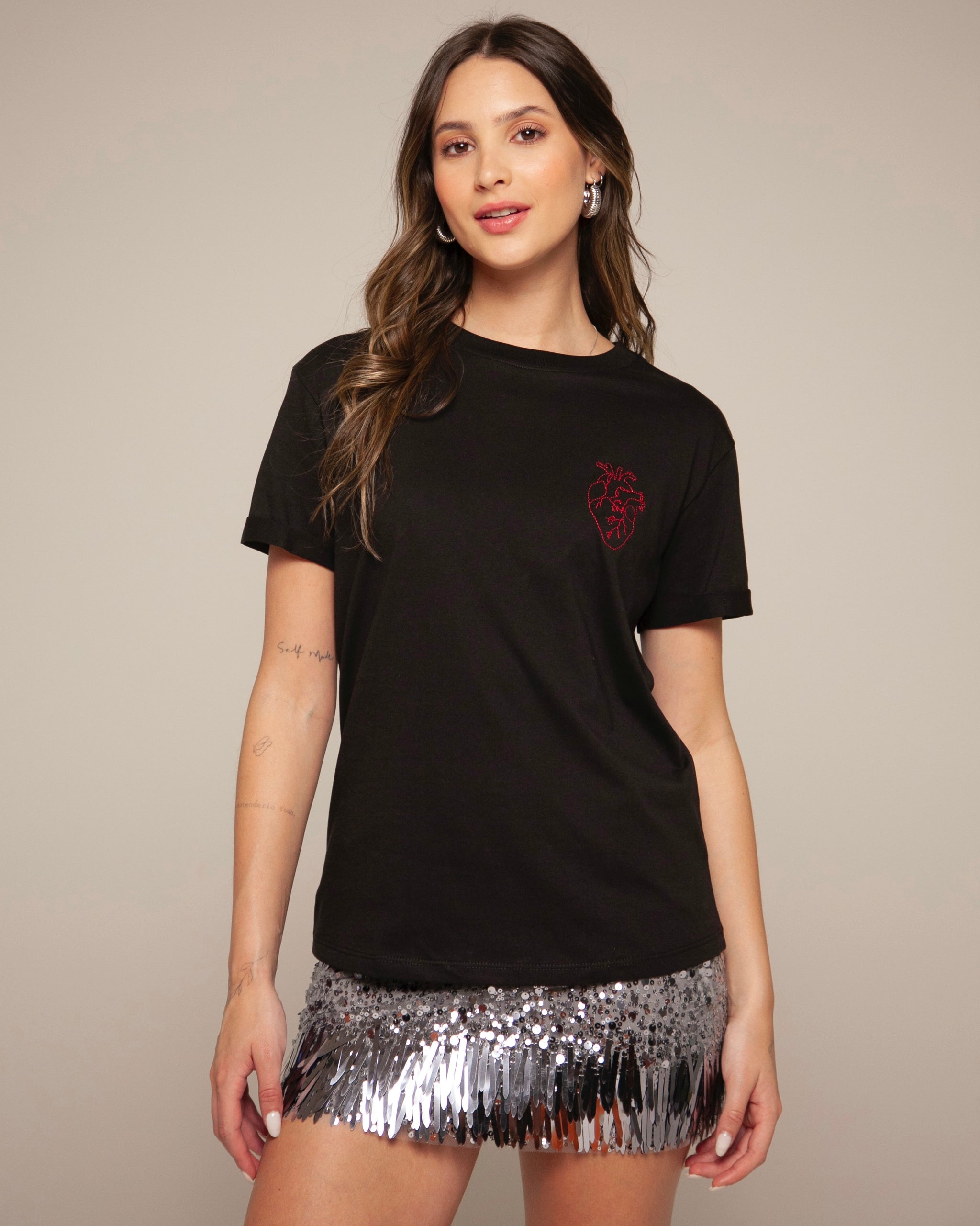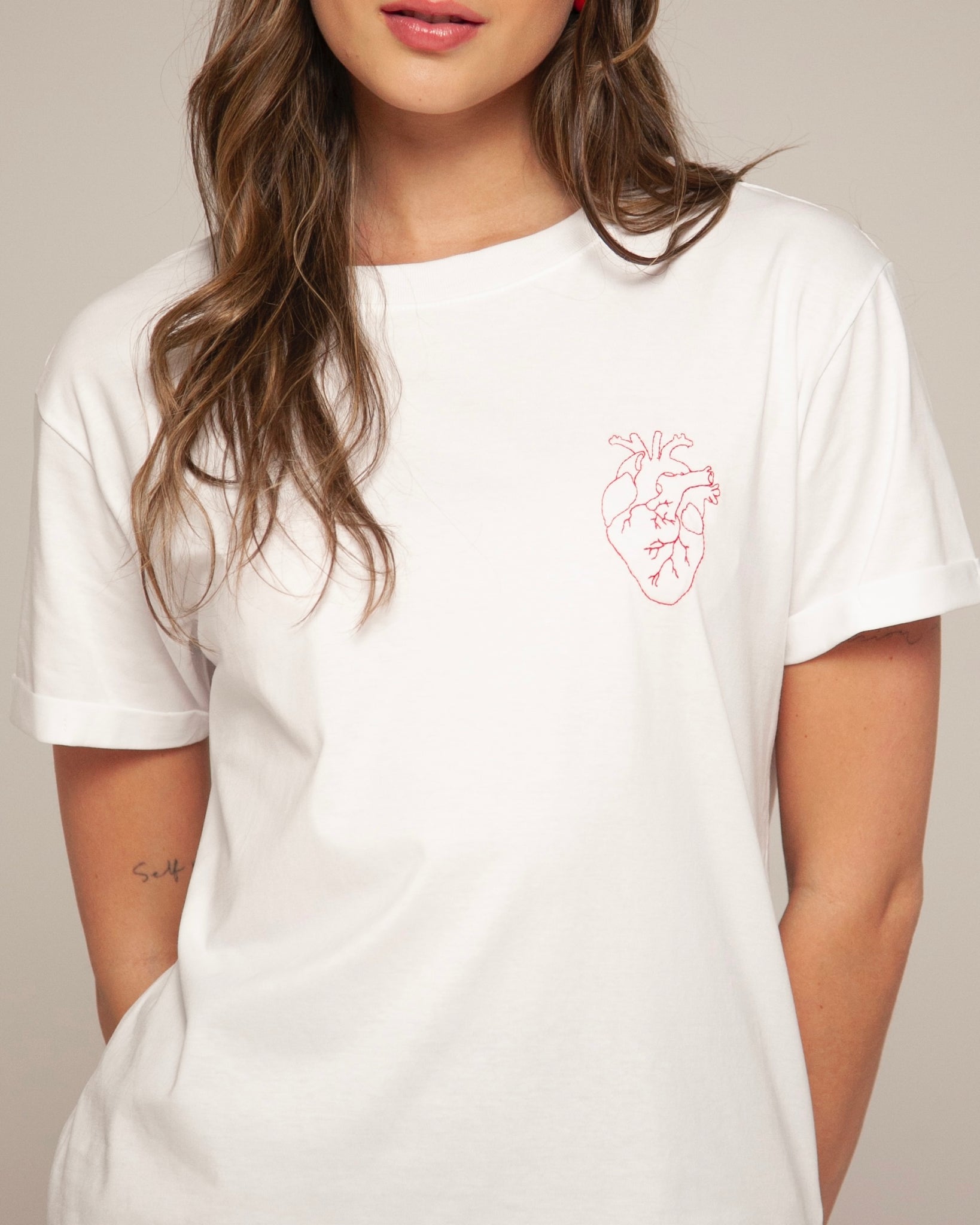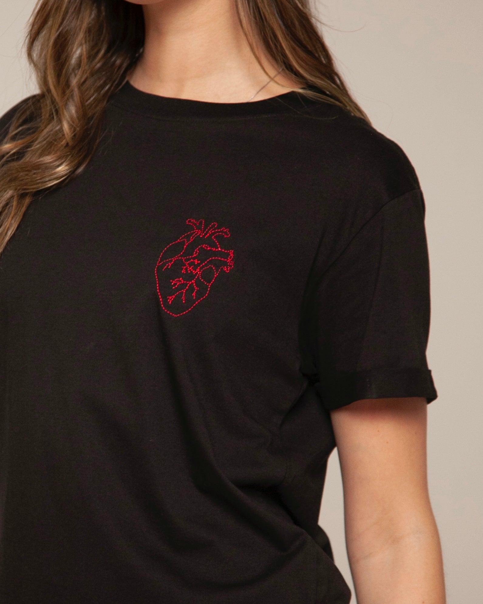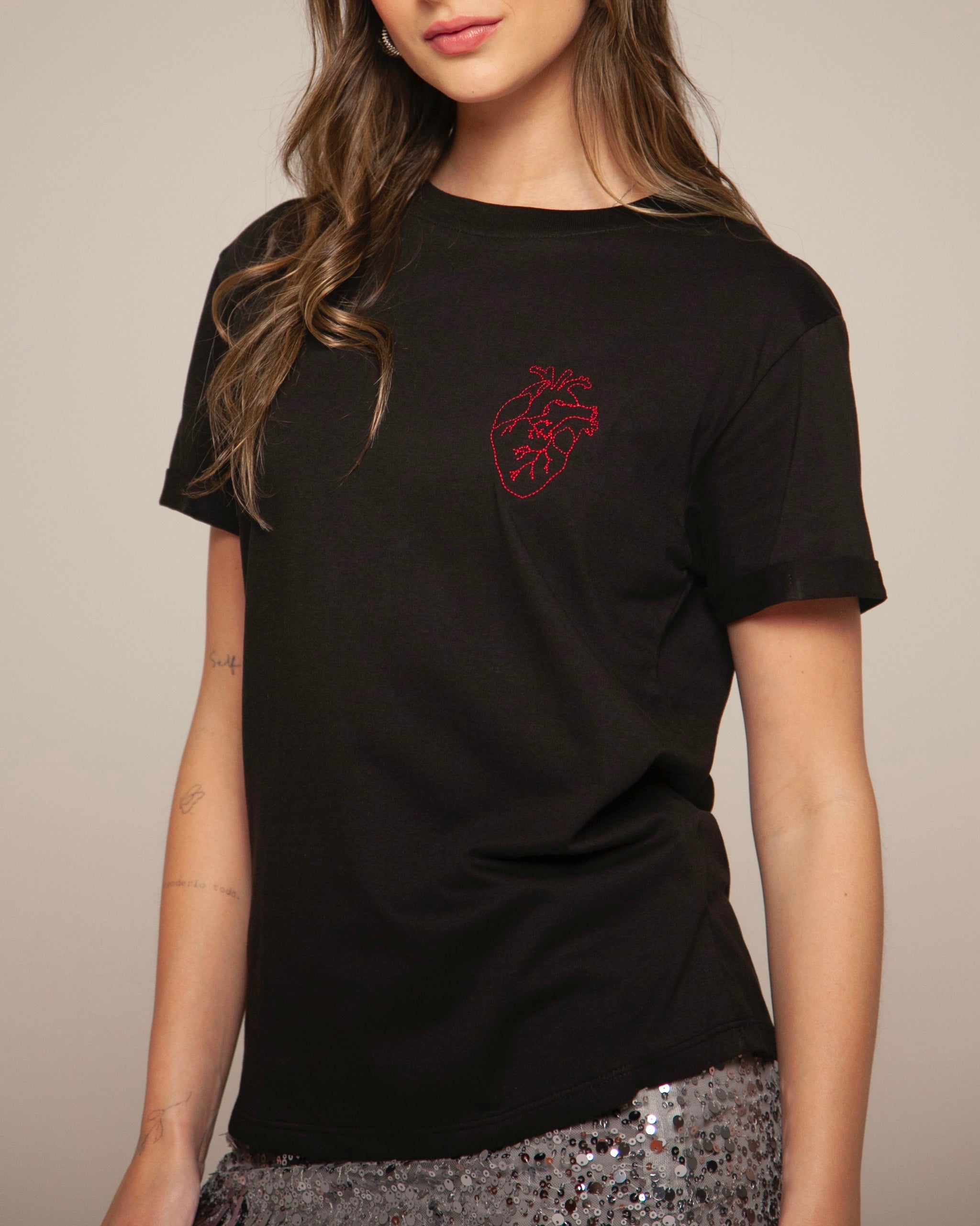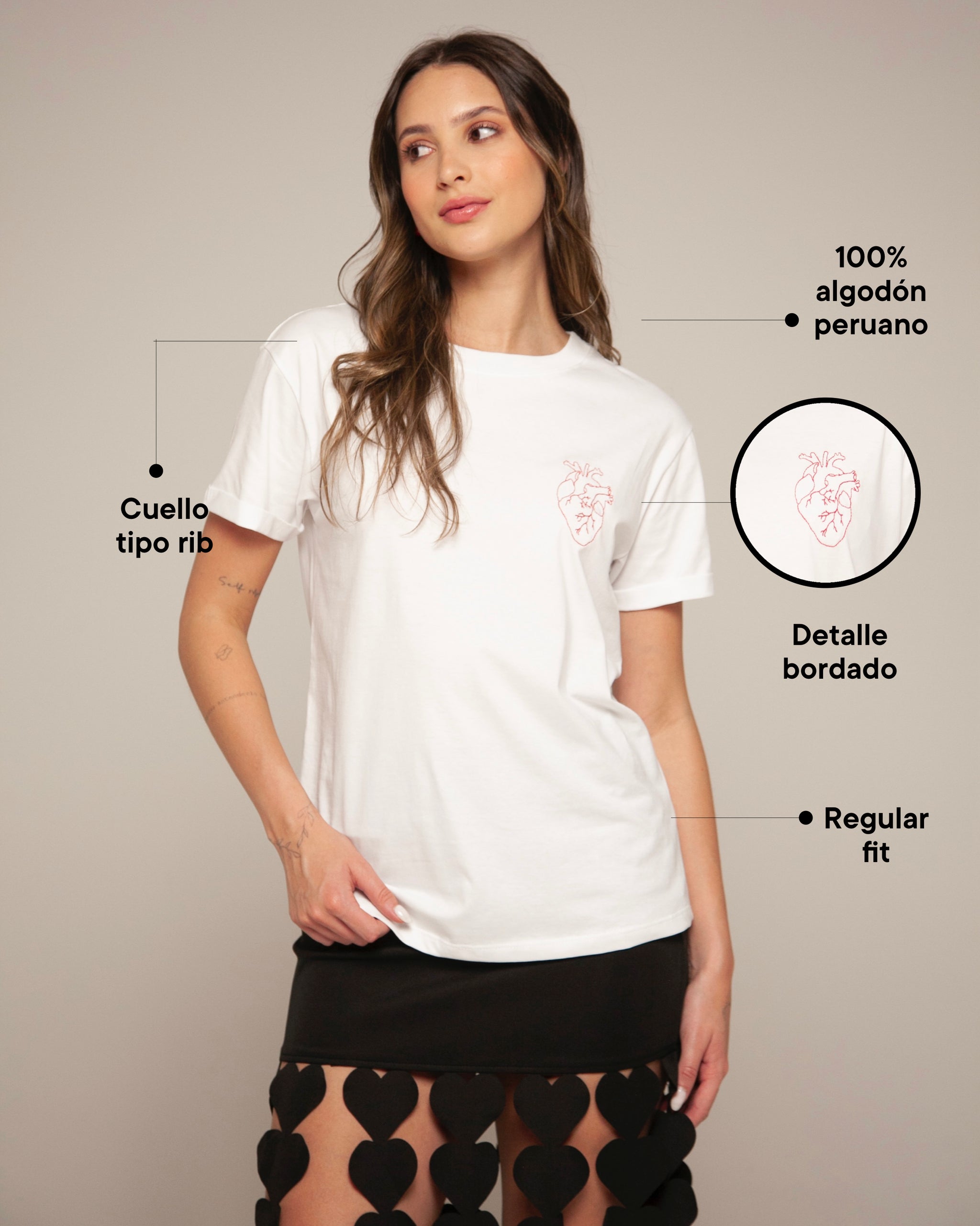 Lo especial está en el detalle: un bordado rojo de corazón anatómico, sello de BASICAL, que no solo adorna sino que cuenta una historia.