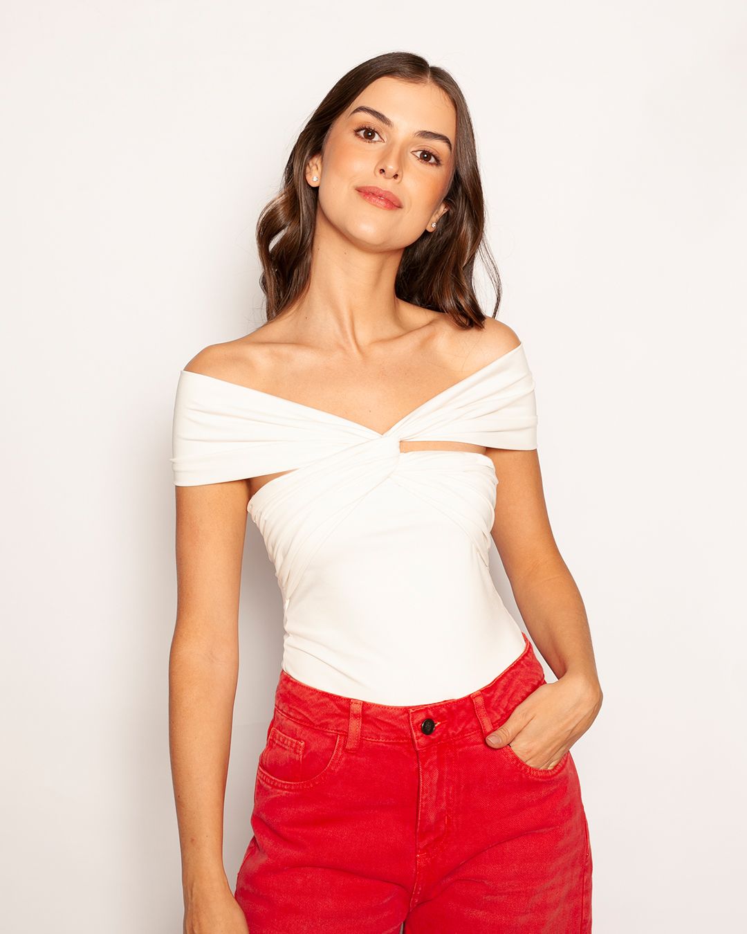 Body off-shoulder con cruce frontal y efecto drapeado. Su tela elástica da un ajuste cómodo, firme y con diseño, ideal para looks elevados pero sin esfuerzo.