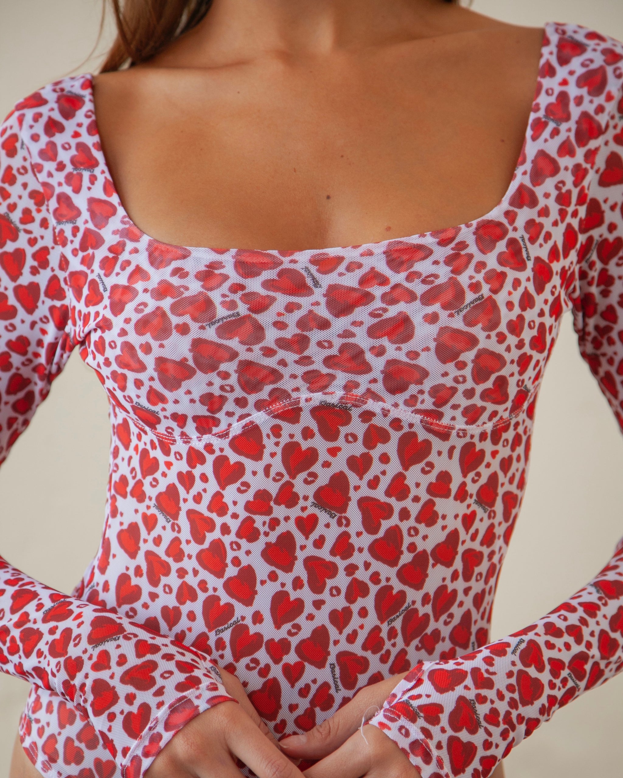 Nuestro body de mesh estampado con corazones rojos combina estética girly y un aire juguetón. Diseñado con detalles únicos: ojal en las mangas para darle un toque fun y doble malla en la zona del busto que asegura mayor cobertura, permitiéndote usarlo solo o en layering con otras prendas. Una pieza versátil que pasa de un look de fiesta a uno casual con la misma facilidad.