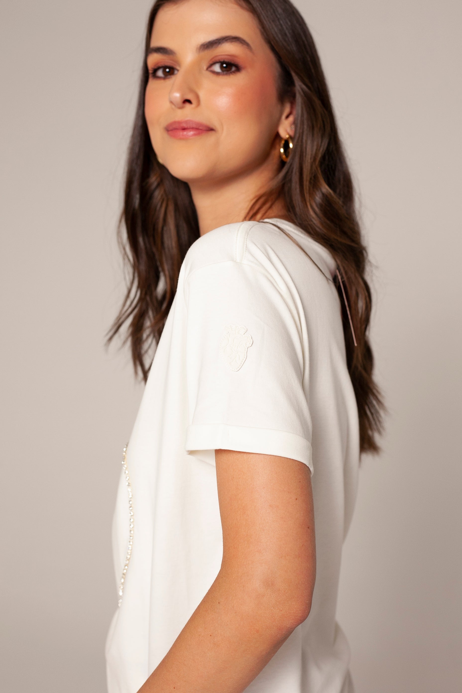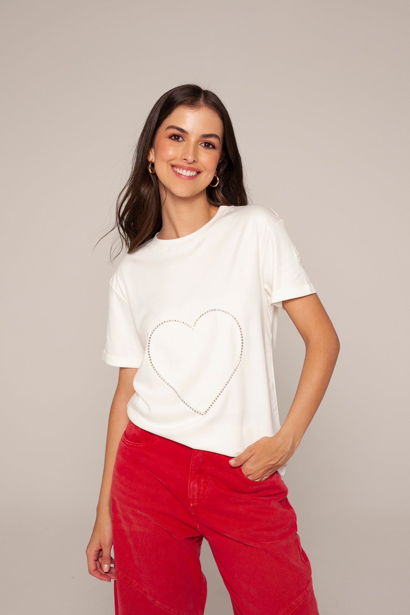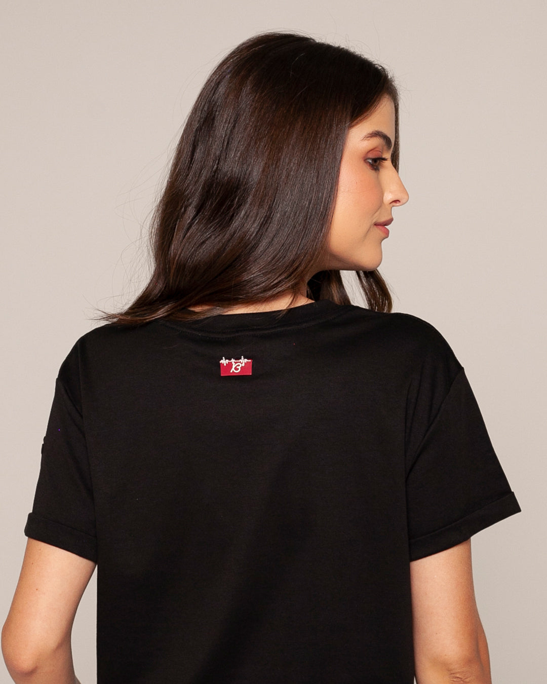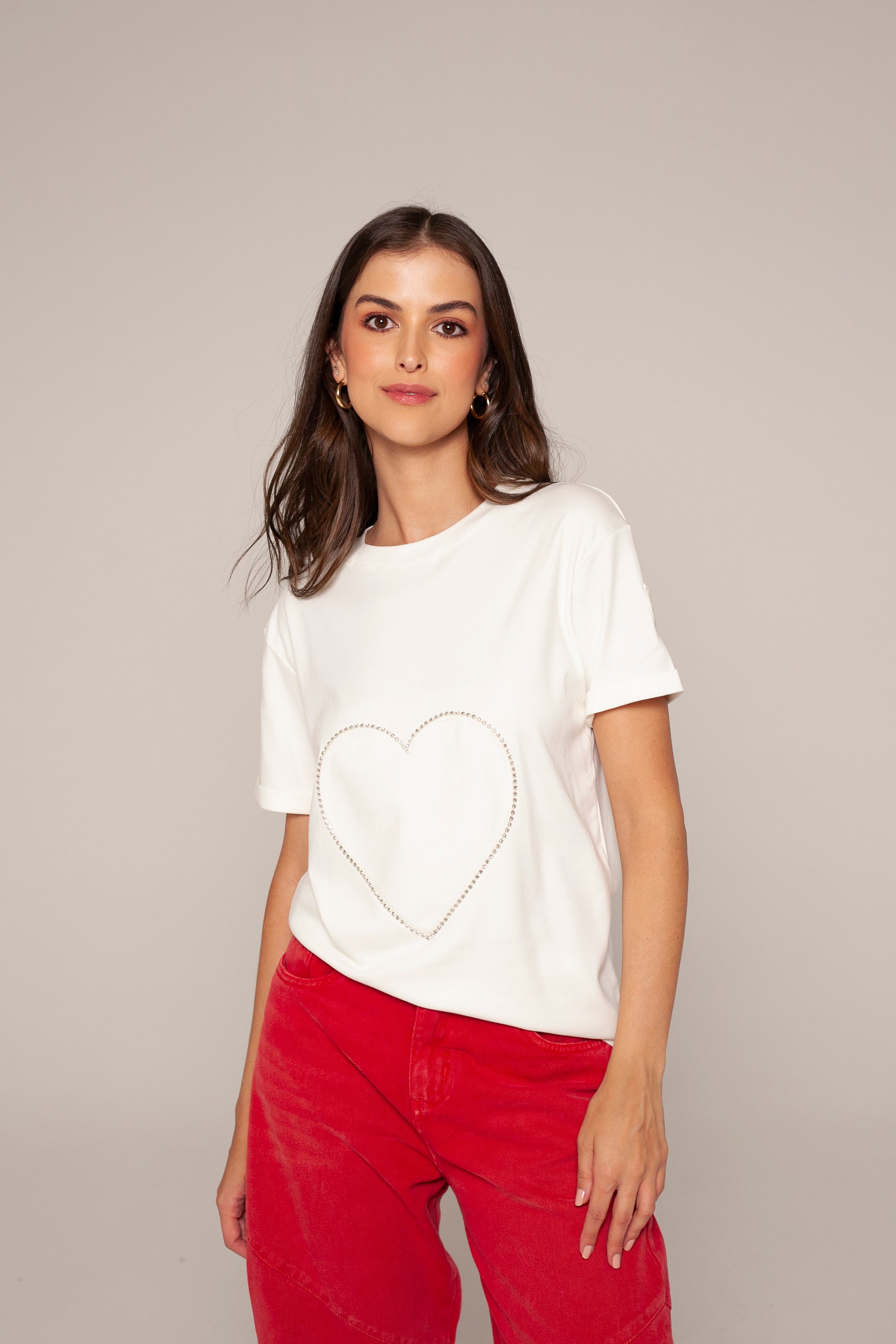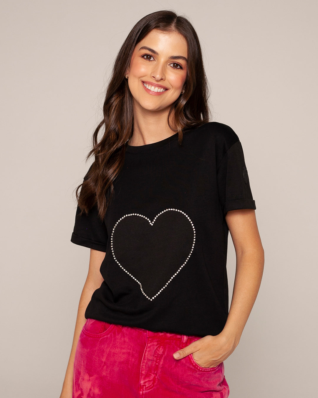 Camiseta negra de algodón peruano con un corazon delineado en brillantes. Un diseño minimalista pero llamativo, ideal para darle un toque chic y sofisticado a tu look casual.