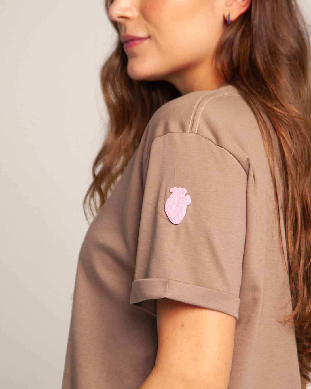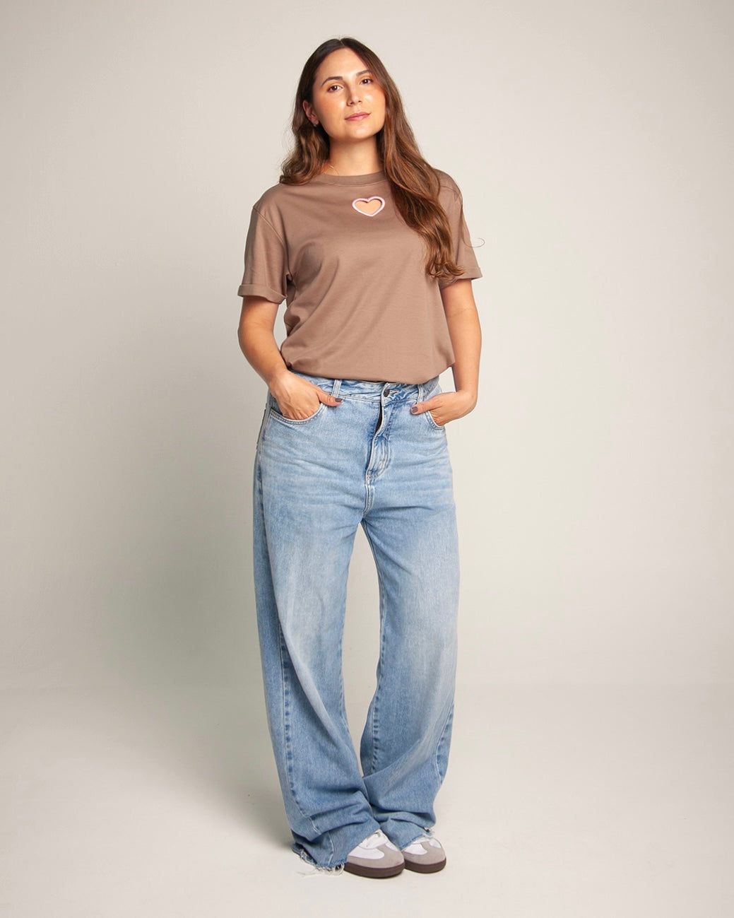 Hecha en algodón peruano 100%, tiene una silueta limpia, cuello reforzado y el característico recorte en forma de corazón al centro del pecho, que simboliza lo que somos: una marca que late desde adentro.