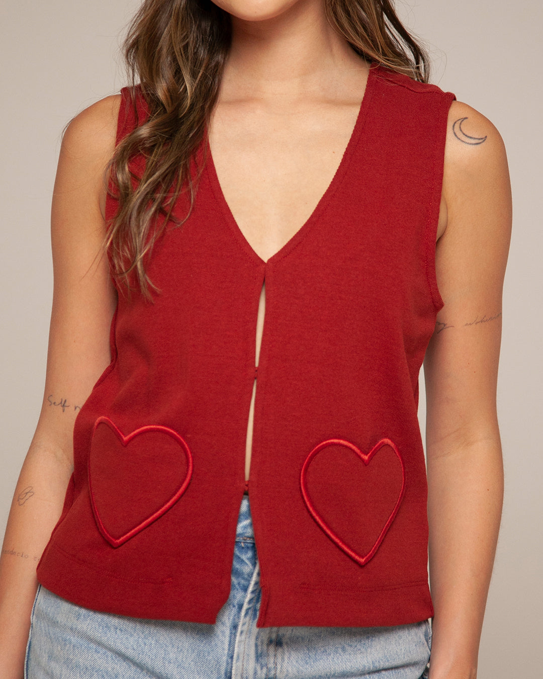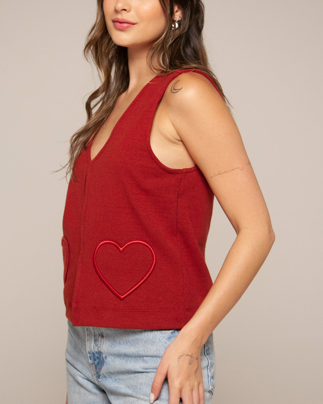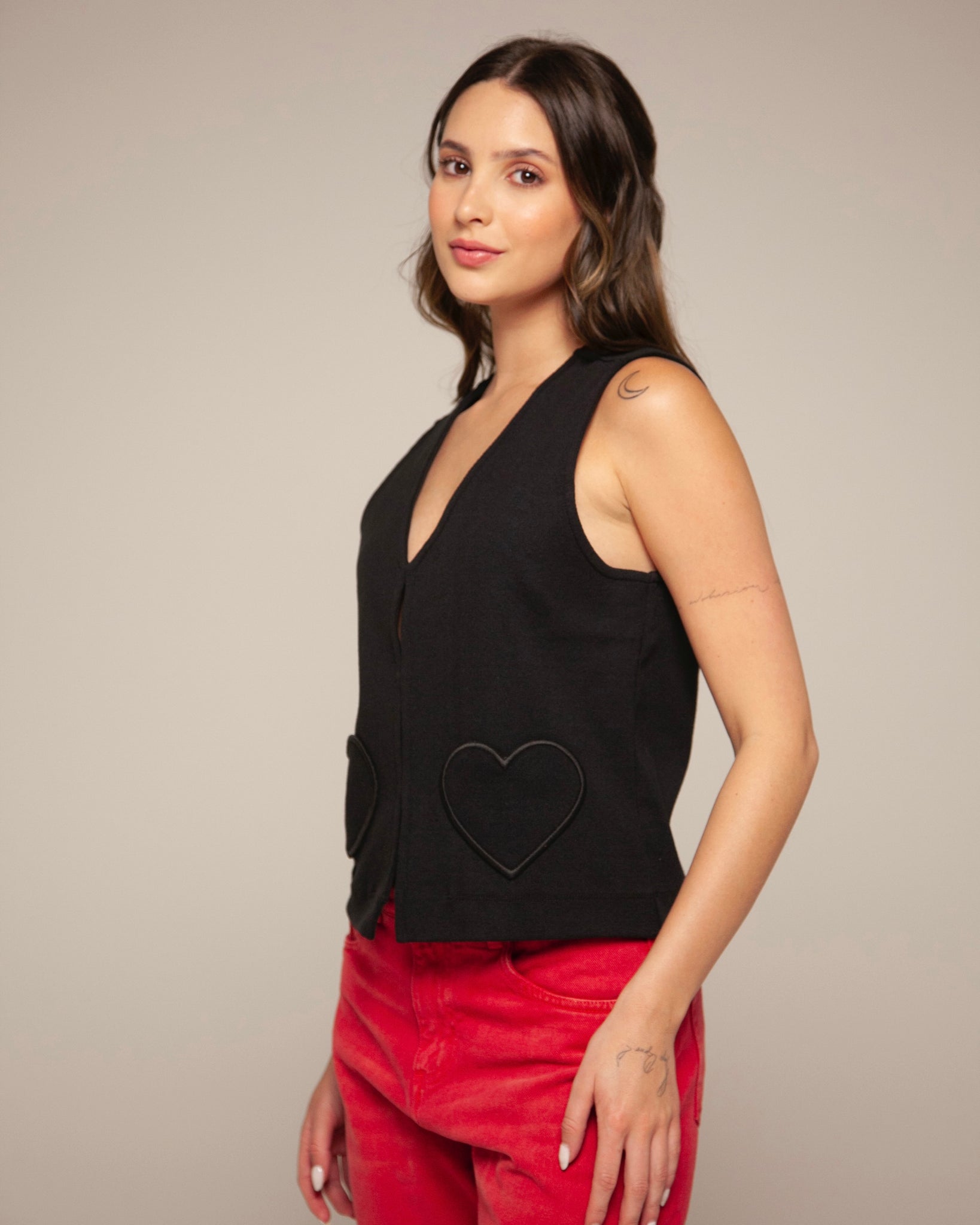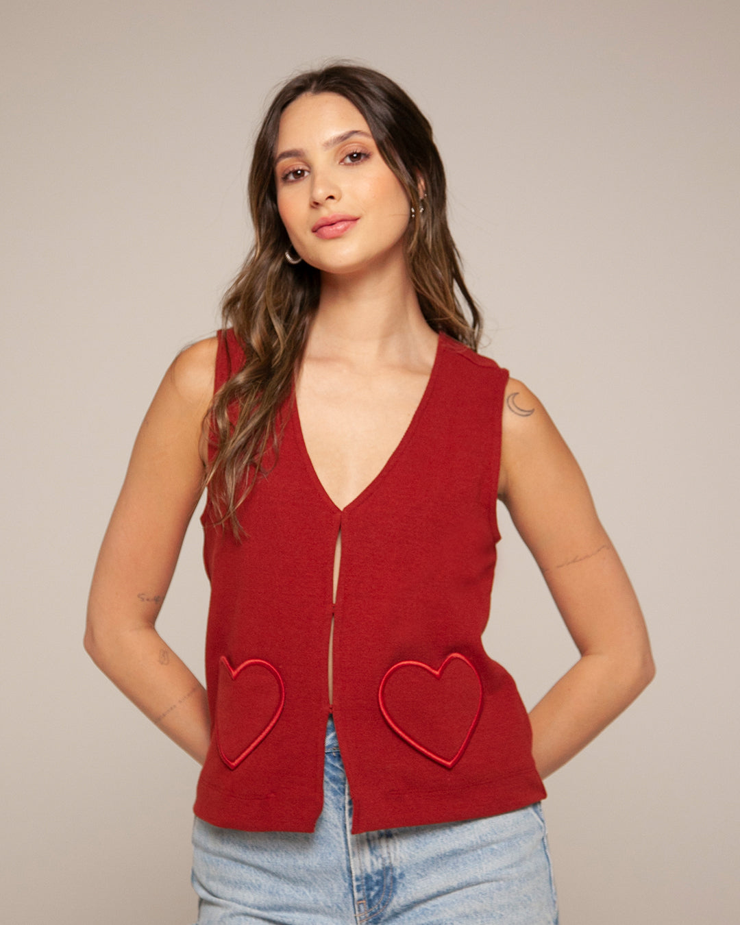 Un nueva versión del chaleco que eleva cualquier outfit. Con detalles de corazón tipo bolsillo adelante y botones para un look más versátil que puedes usar abierto o cerrado. Detalles bordados que hacen esta prenda única y un must en tu clóset.
